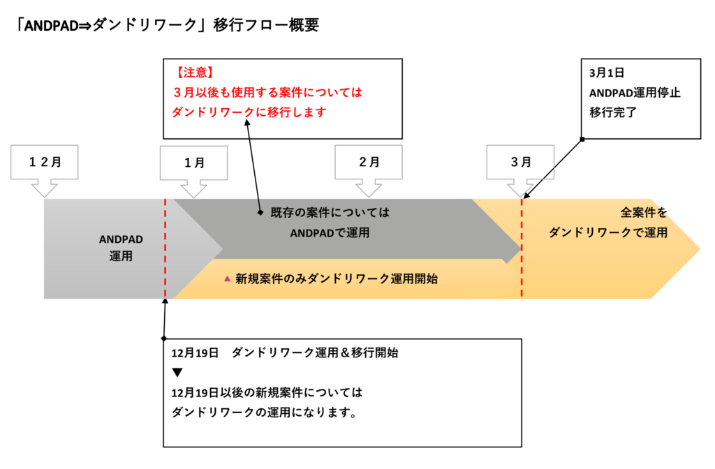 ダンドリワーク移行のスケジュールとして3月にはANDPAD運用を停止します。